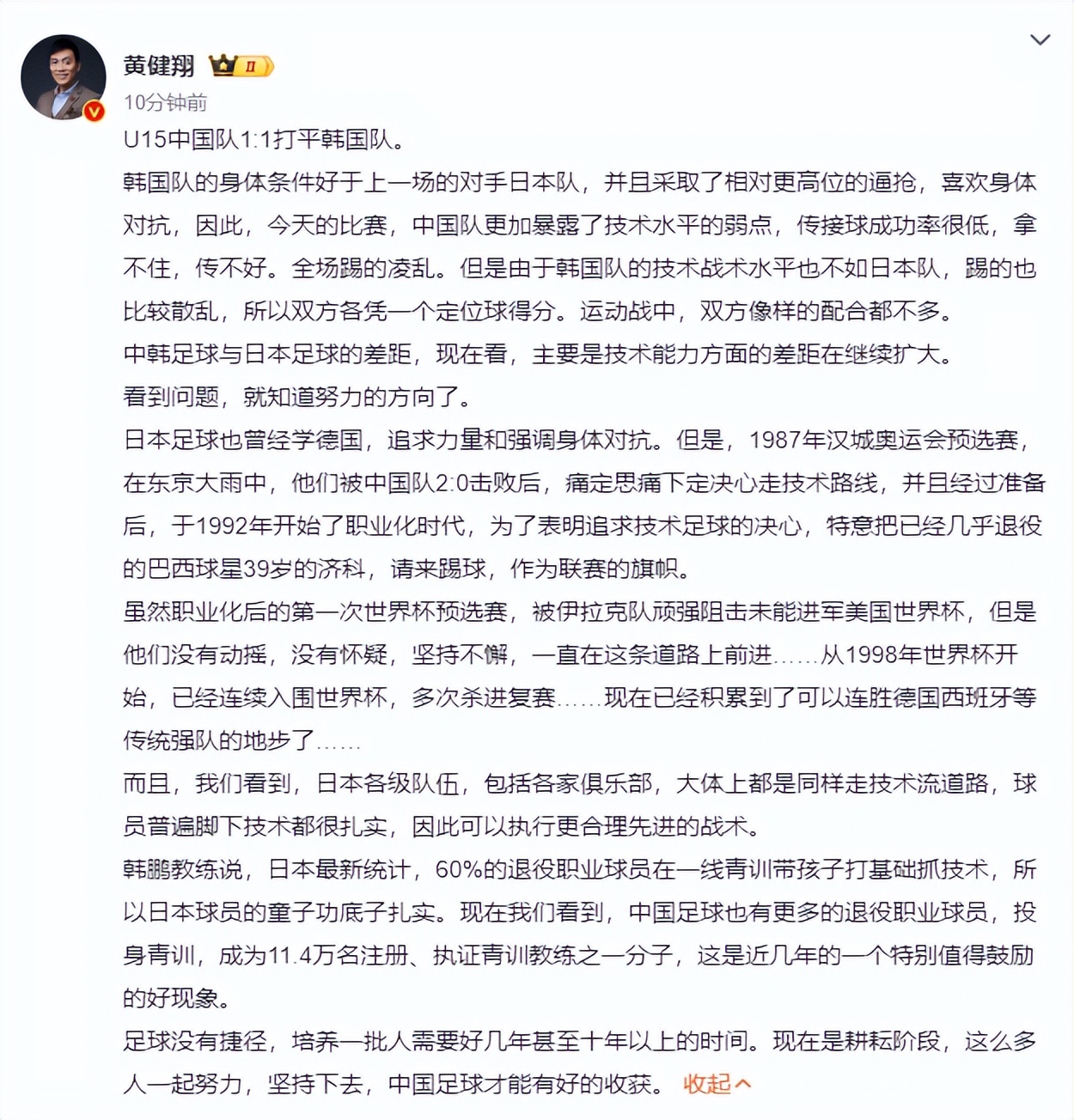 以1比1的比分战平韩国队之后,U15国足在东亚杯2战不胜。著名解说员黄健翔指出,“中国队更加暴露了技术水平的弱点”。